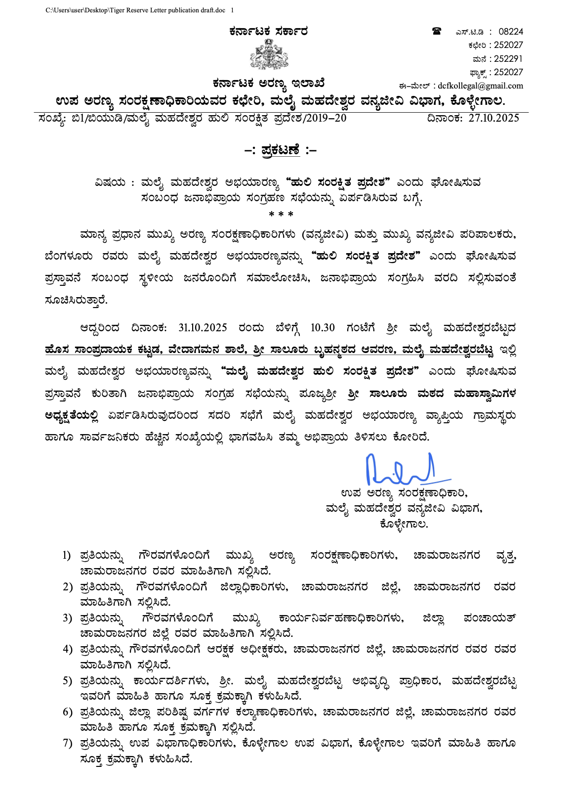 In 2022, on reading about the proposal from GoK to NTCA to upgrade MM Hills Wildlife Sanctuary into a Tiger Reserve, I had asked the following questions in an RTI application.